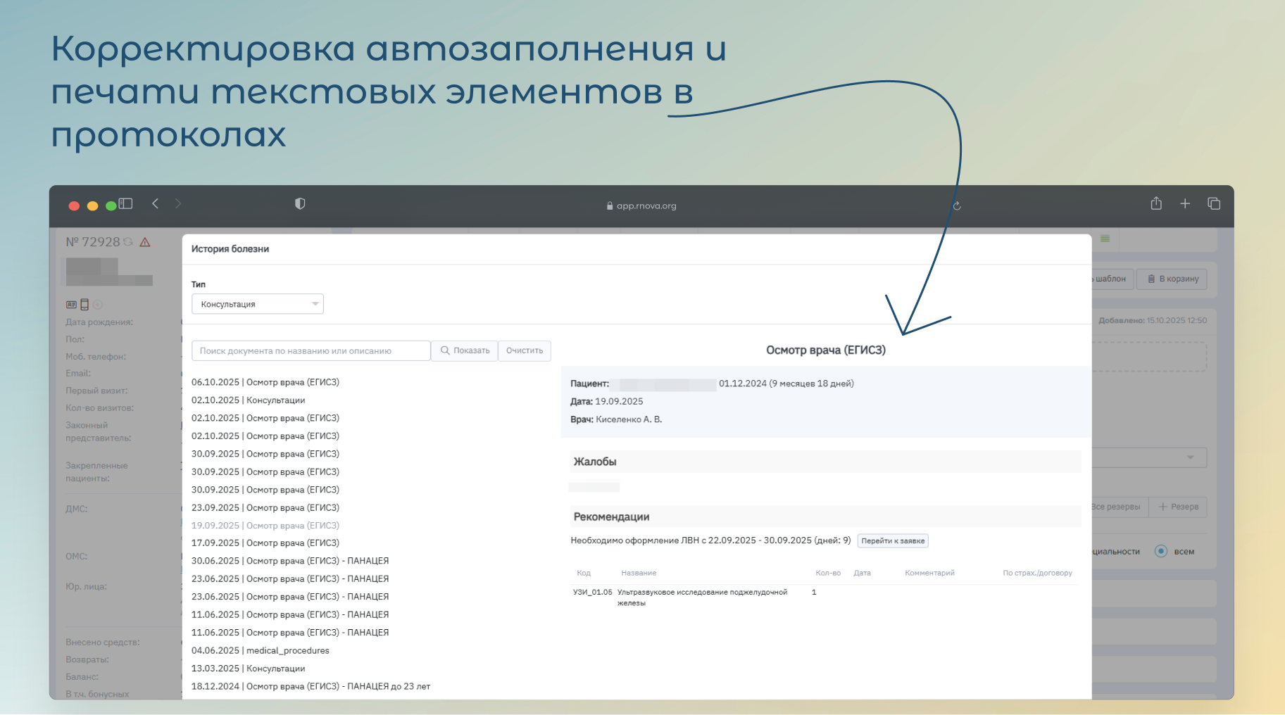 Теперь при создании медицинского документа в карте пациента текстовые элементы протокола, которые в настройках протокола помечены как автоматически заполняемые текстом, указанным в настройках, — автоматически заполняются, но не выбираются для печати по умолчанию, как было ранее.