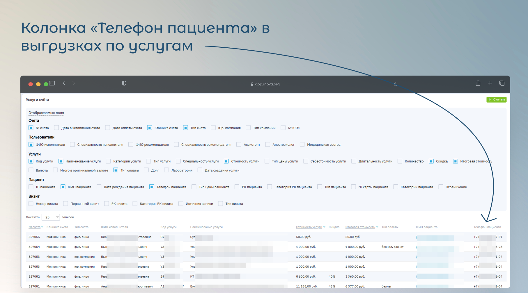 Теперь пользователи могут формировать выгрузки с более полным набором персональных данных пациентов — для анализа, сверки или использования в собственных внешних отчётных формах, без необходимости вручную добавлять телефоны.