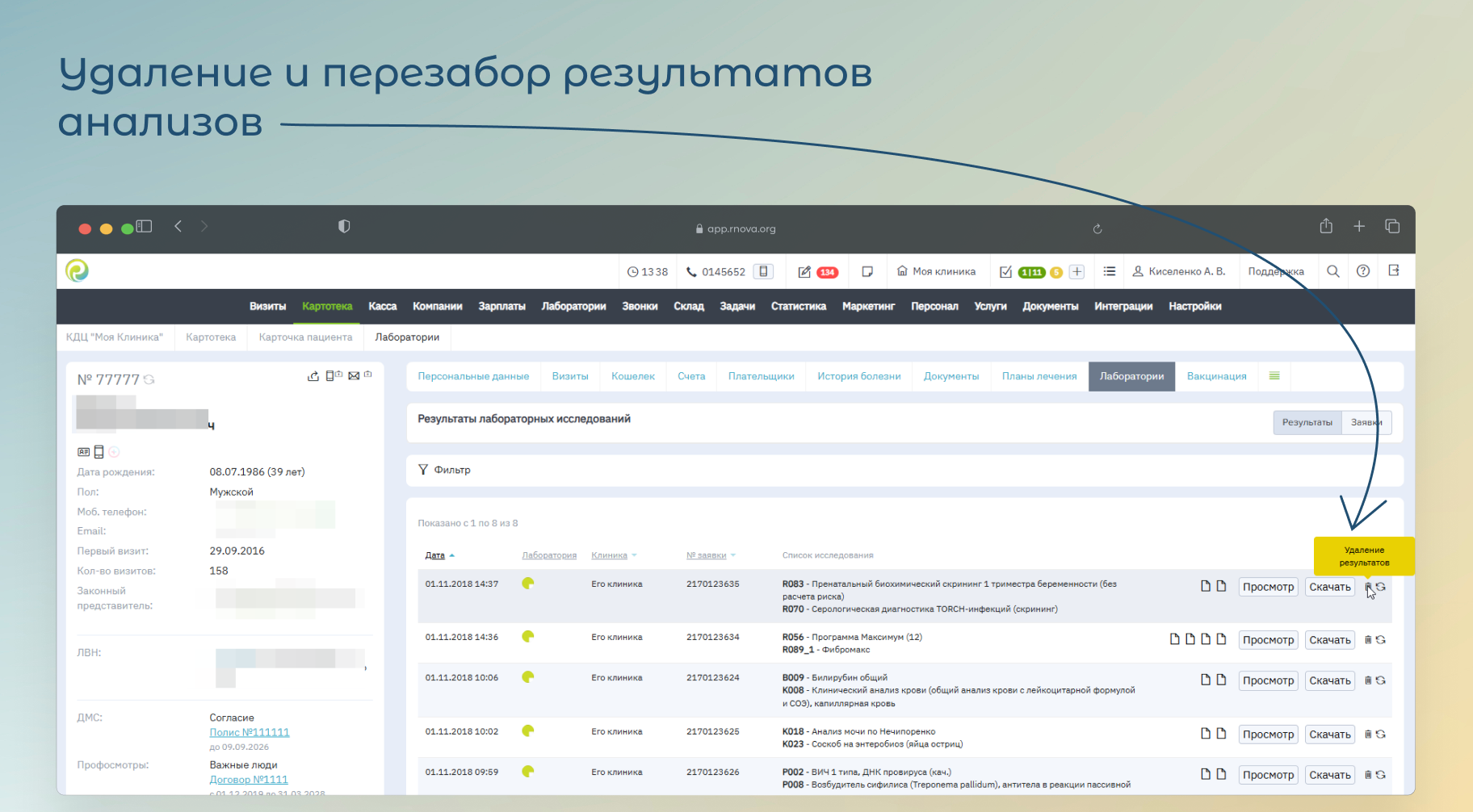 В модуле Лаборатории добавлены новые возможности для работы с результатами анализов — теперь пользователи с соответствующими правами могут удалять или перезапрашивать результаты по заявке в лабораторию.
