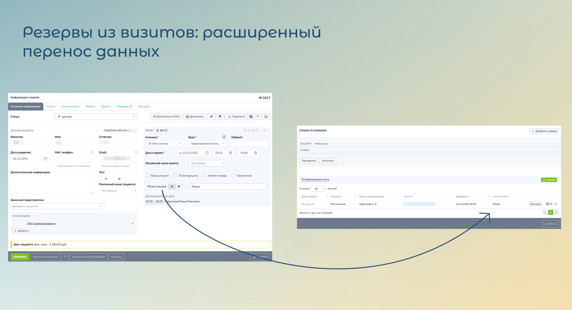 Напоминаем, что резерв автоматически создается, если сотрудник отмечает галочку «Может раньше» и при необходимости добавляет примечание. При этом теперь в создаваемый резерв данные из визита подтягиваются автоматически: комментарий, услуги и (если применимо) специальность врача.