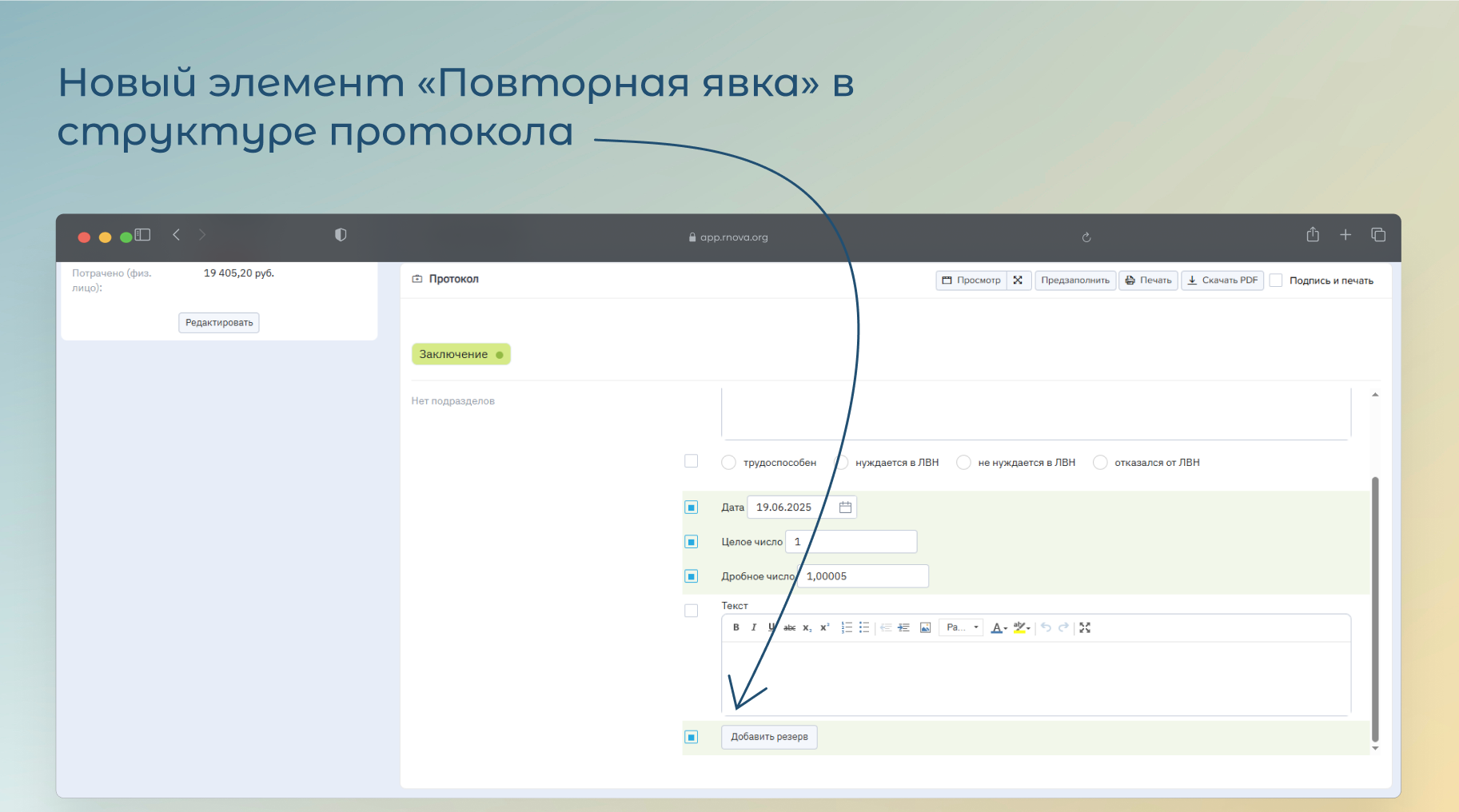 В систему добавлен новый базовый элемент для протоколов — «Повторная явка». Он позволяет прямо из медицинского документа создать резерв и связать его с текущим протоколом.