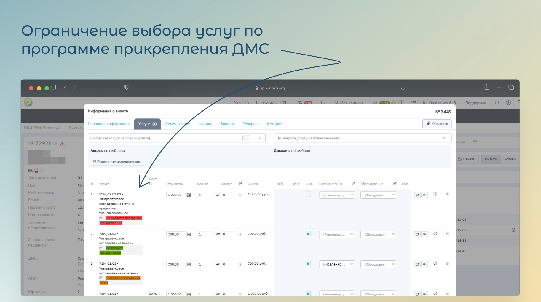 Теперь при работе с ДМС можно быть уверенным, что в визит и счёт попадут только услуги, разрешённые программой прикрепления пациента.
