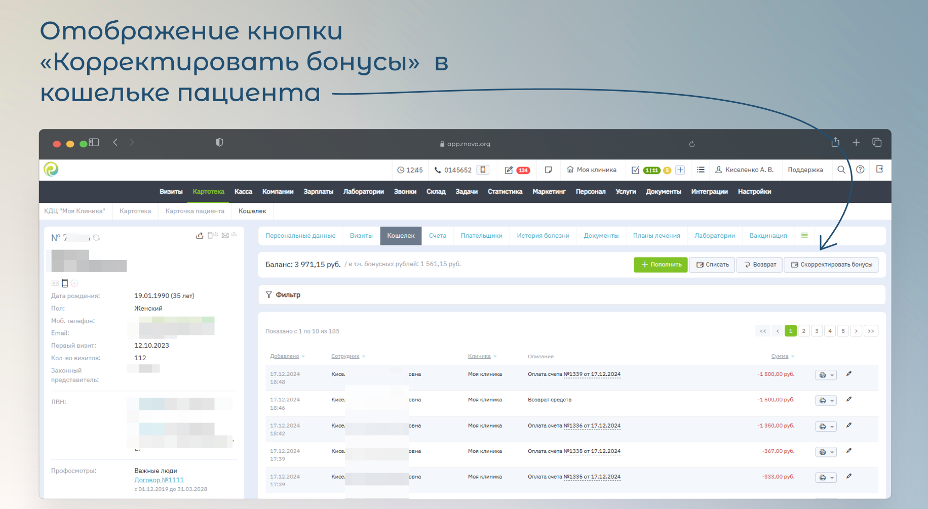 Ранее кнопка «Корректировать бонусы» появлялась только при расхождении баланса кошелька пациента и бонусного счёта. Из-за этого клиники не могли внести корректировку, если расхождение уже было устранено вручную.