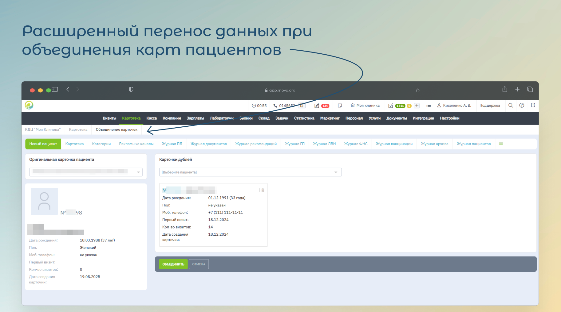 Усовершенствован механизм объединения дублирующихся карт пациентов — теперь система корректнее переносит данные из дублей в основную карту.