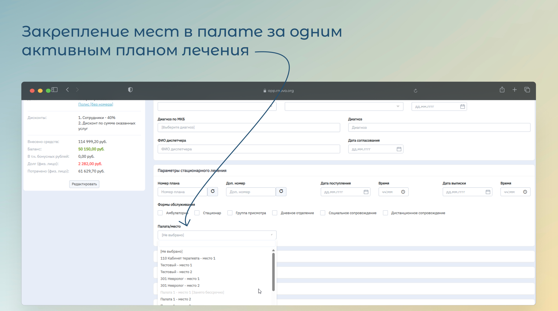 При выборе места в палате система теперь отображает занятые места с пометкой [Занято + срок плана лечения].