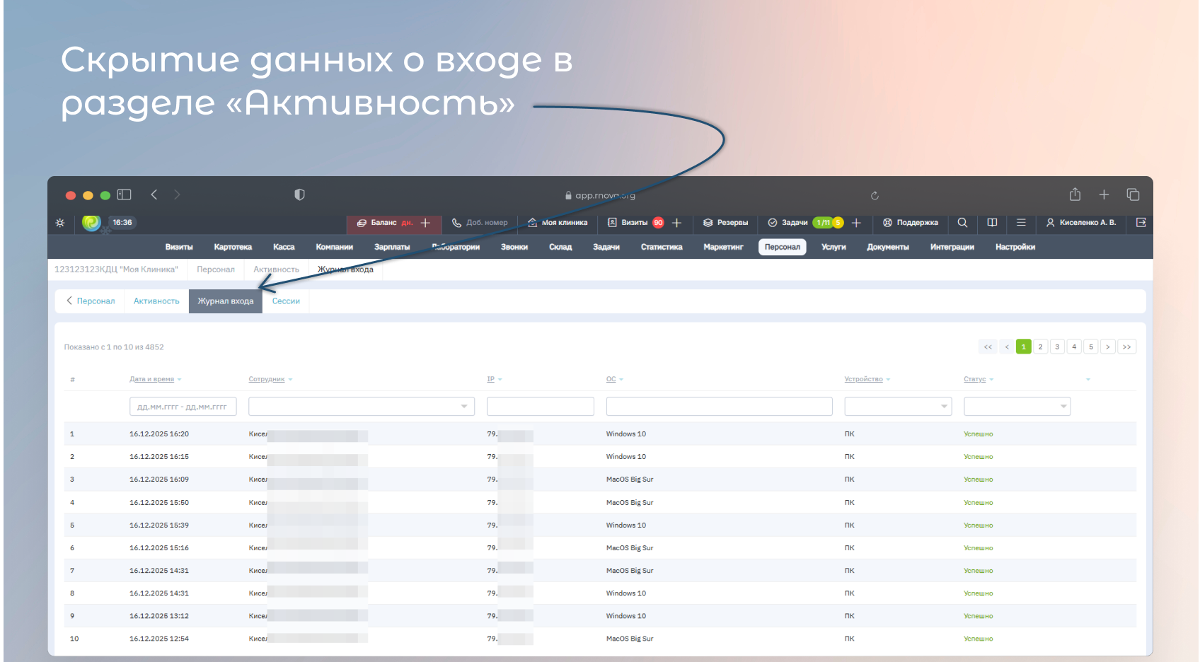 Эти данные доступны в разделе «Персонал → Активность → Журнал входа», поэтому их исключение из общей активности делает раздел чище и удобнее для анализа действий сотрудников.