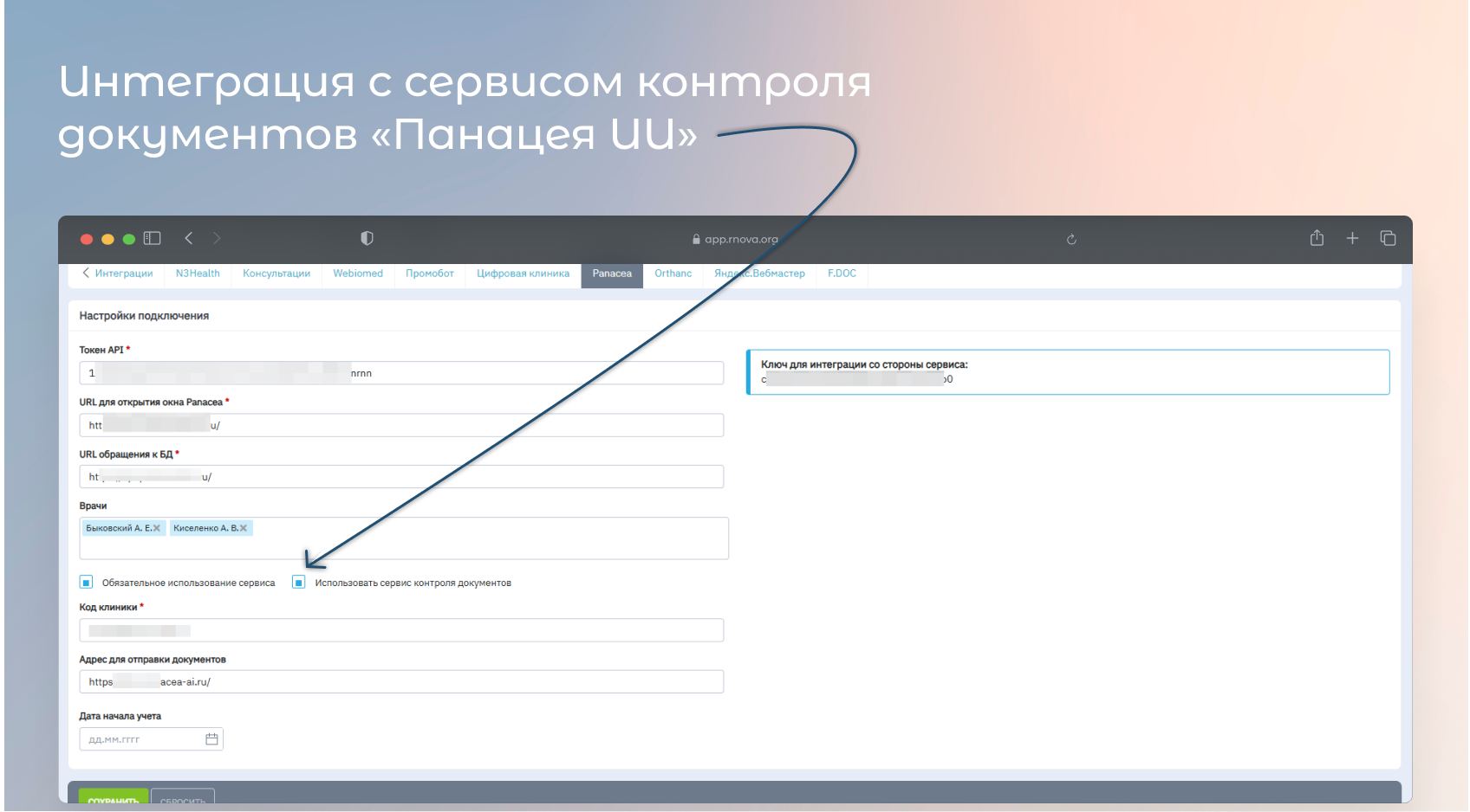 Интеграция работает по желанию клиники и настраивается в системе. В разделе Интеграции → Сервисы → Panacea появился новый параметр «Использовать сервис контроля документов».