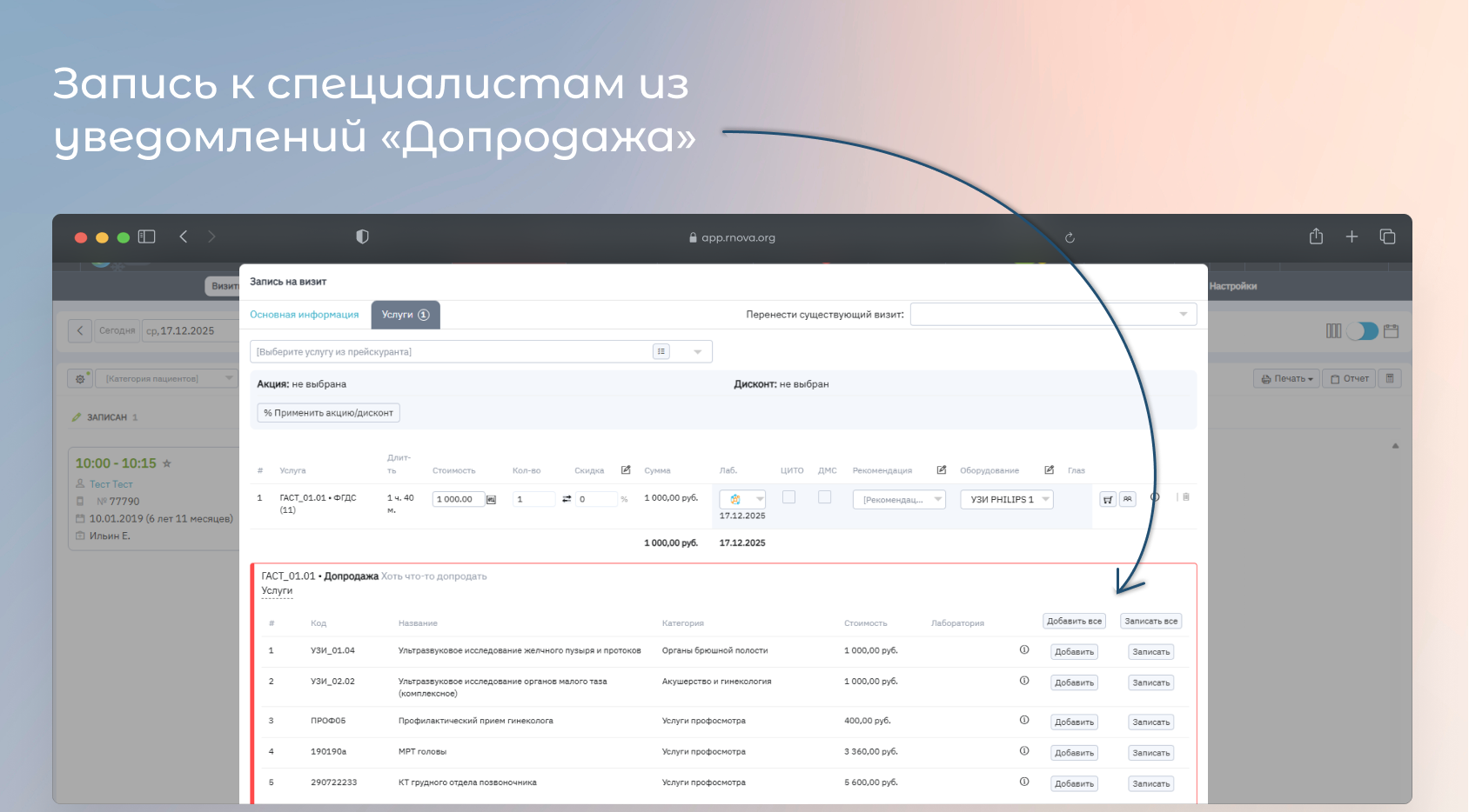 - «Записать все» — для записи пациента на визит сразу со всеми услугами из блока допродажи