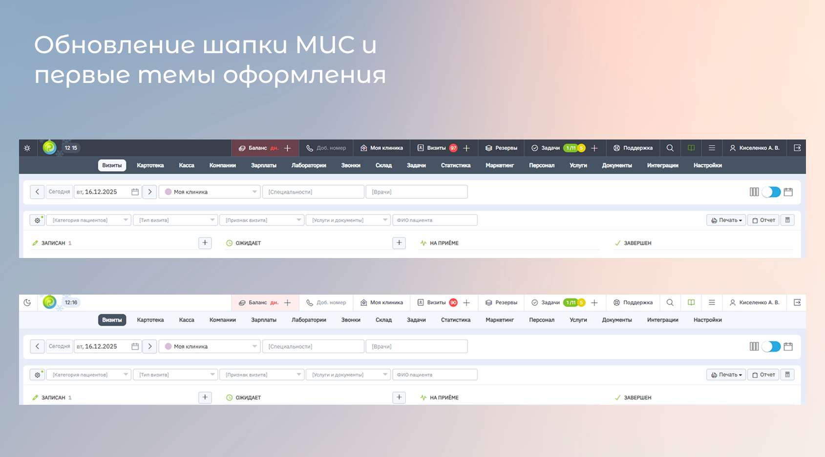 Впервые в МИС появляются две темы оформления — светлая и тёмная. На текущем этапе темы применяются только к шапке интерфейса.