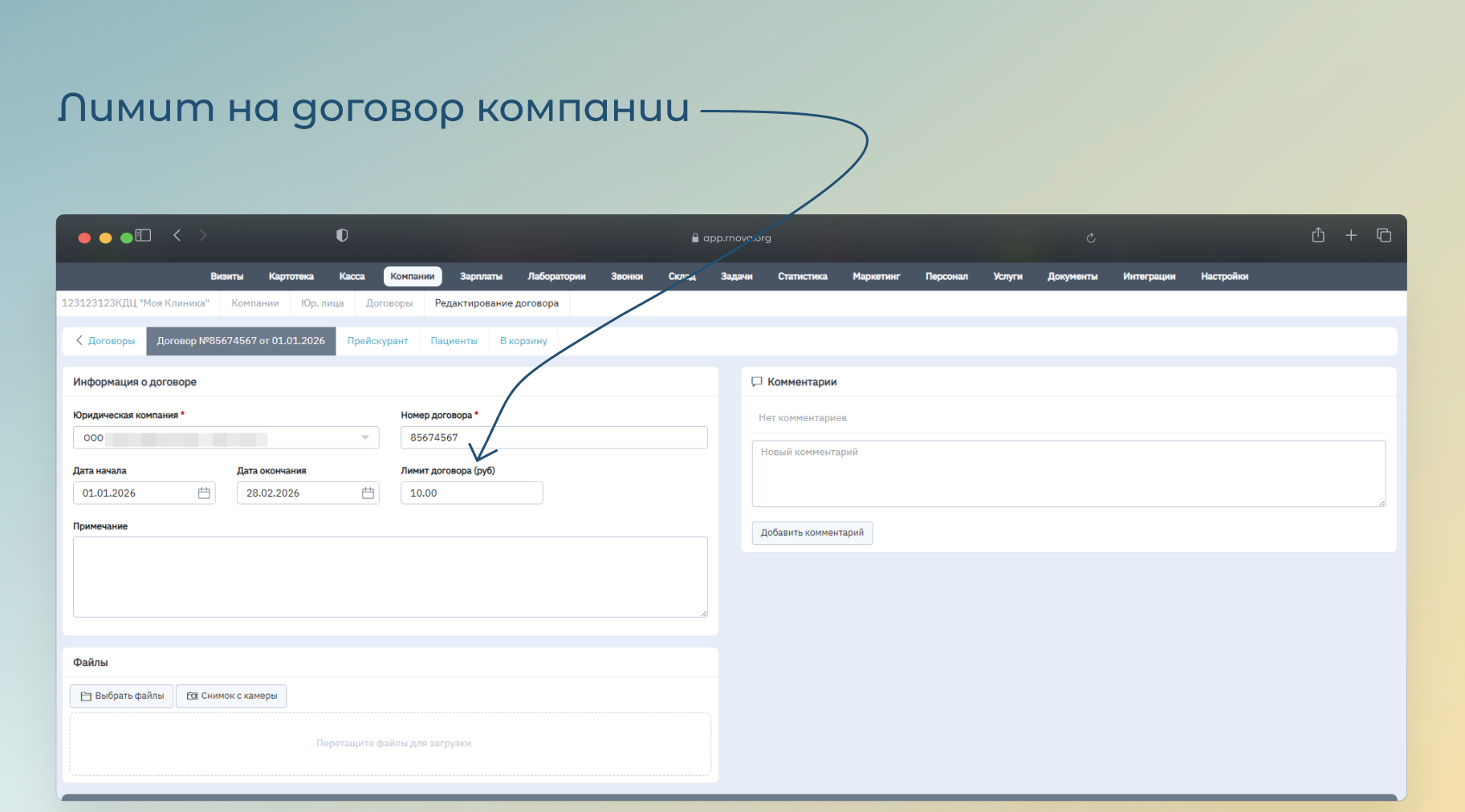 В карточке договора компании «Компании → Юр. лица → Договоры → Карточка договора» появилось новое поле «Лимит договора (руб.)». Поле принимает числовые значения с точностью до двух знаков после запятой.