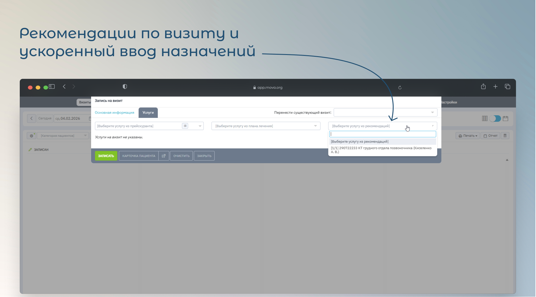 На вкладке «Услуги» в карточке визита появился новый вариант выбора — «Выберите услугу из рекомендаций». В список рекомендаций попадают услуги, которые: