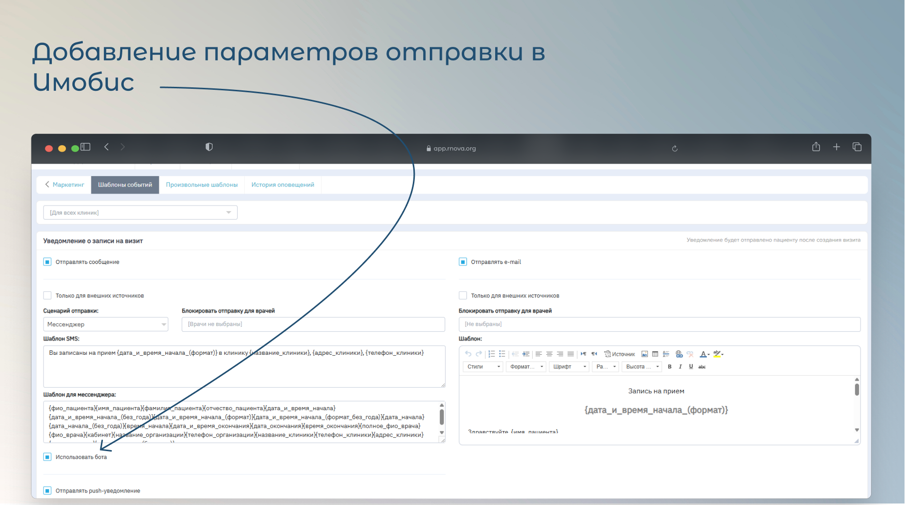 Теперь для каждого события в разделе Маркетинг → Оповещения → Шаблоны событий можно отдельно включать и настраивать отправку push-уведомлений пациентам.
