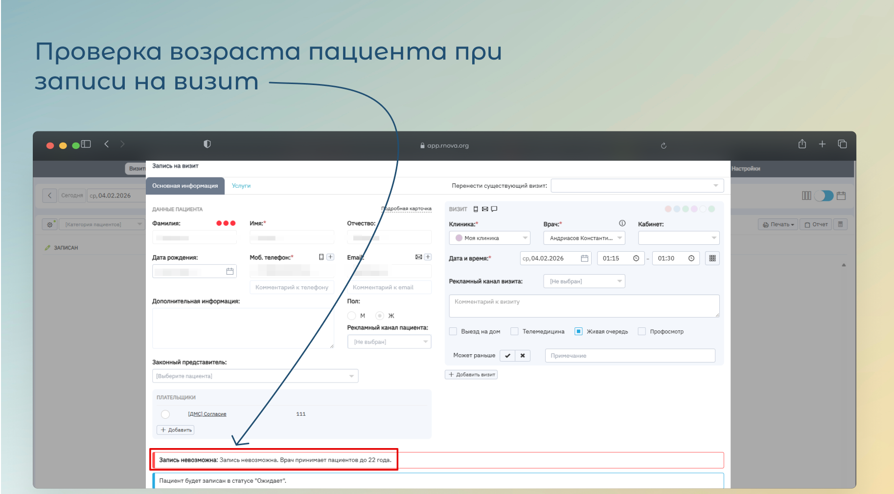 - Если у пациента не указана дата рождения, запись также будет недоступна — система подскажет, что необходимо заполнить данные