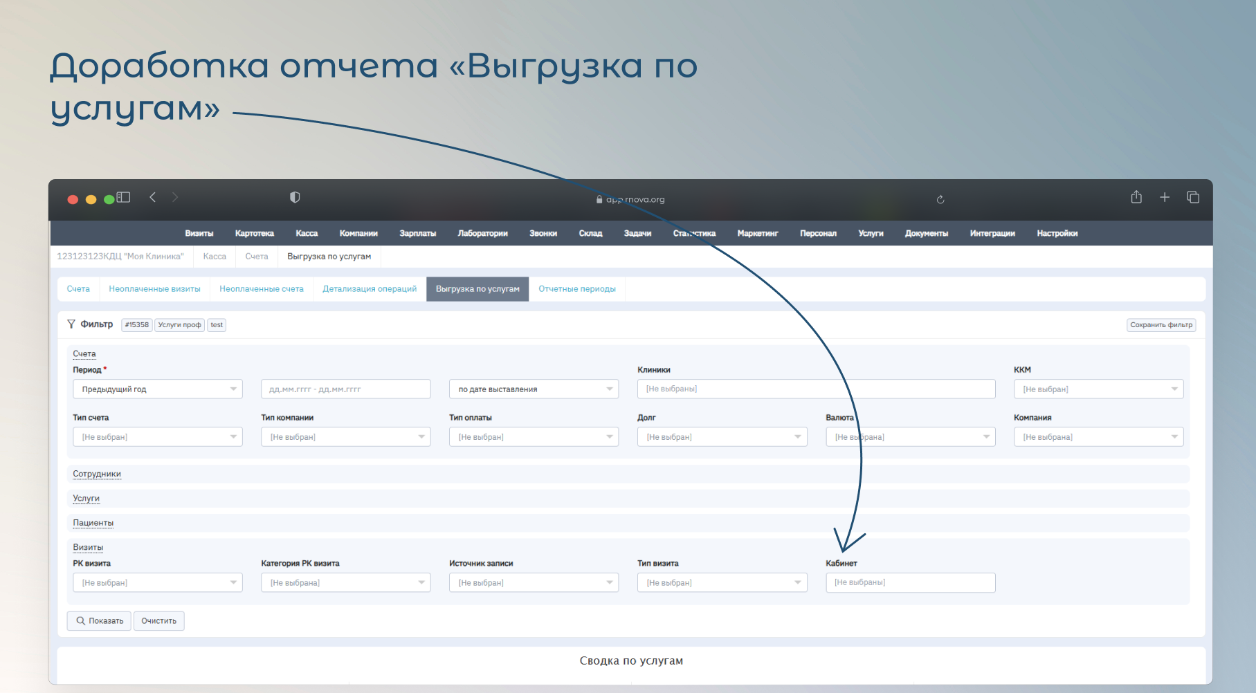 Таким образом, клиника получает возможность более детального анализа услуг по кабинетам и филиалам с удобной фильтрацией и сегментацией данных, что повышает точность управленческой и операционной аналитики.