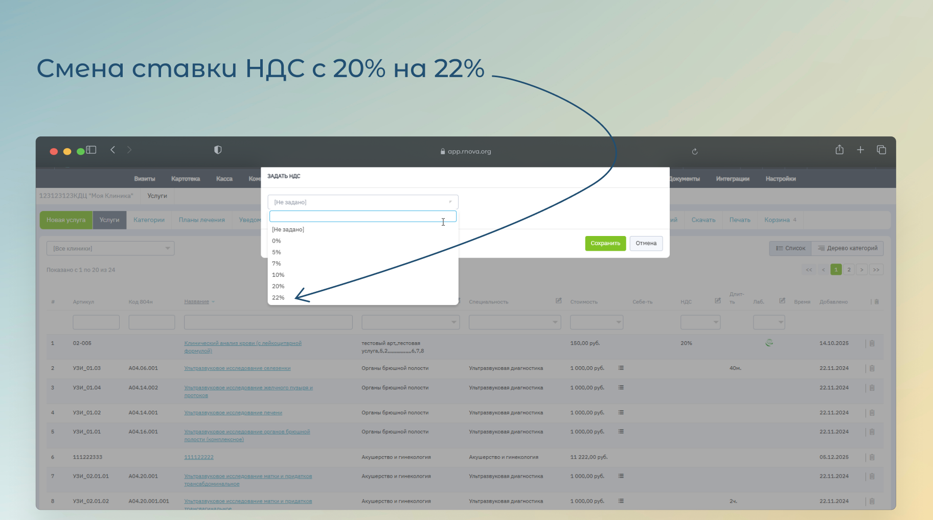 Для индивидуальной смены НДС необходимо перейти в раздел «Услуги → Карточка услуги» и установить ставку НДС 22% для актуальных услуг.