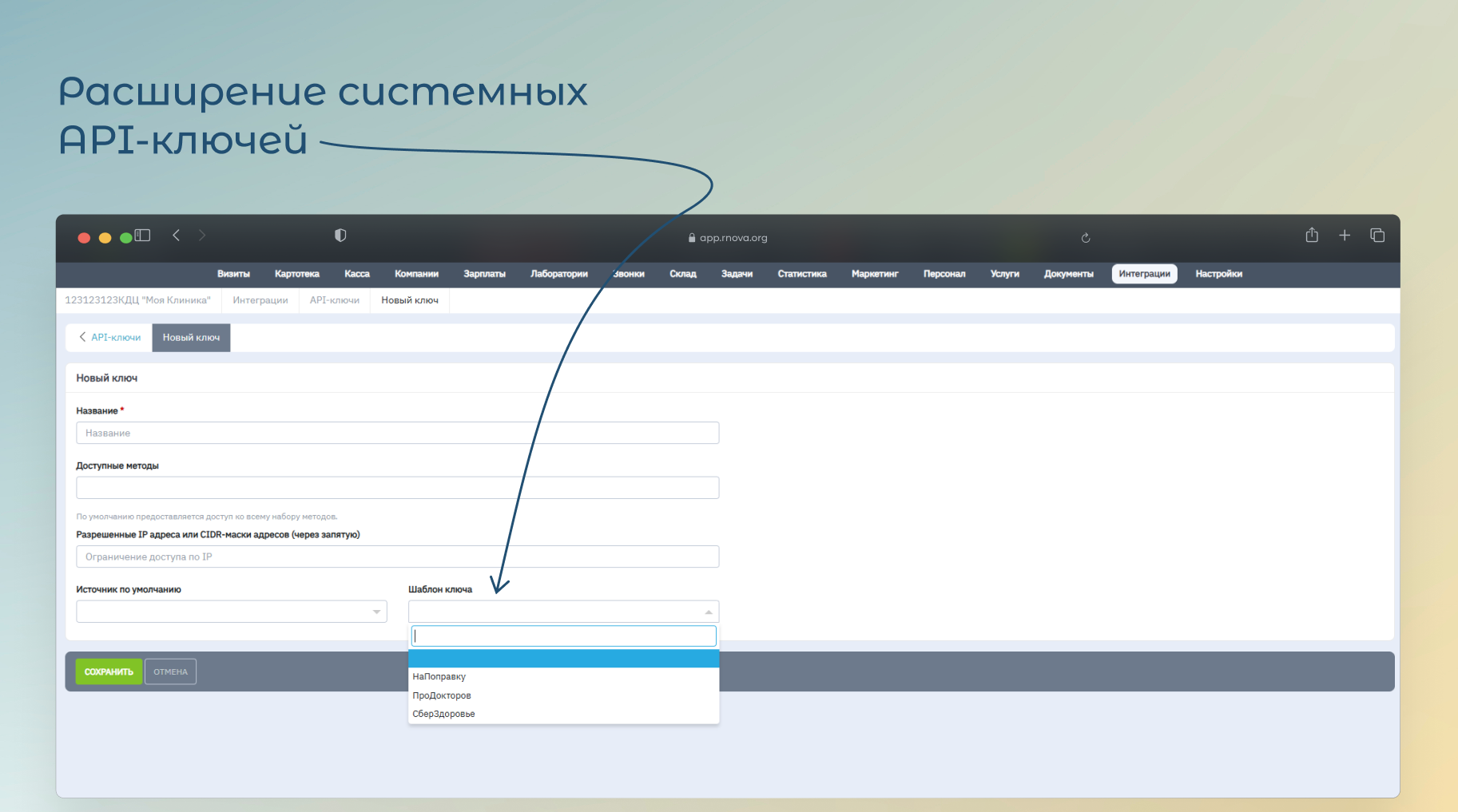 Мы упростили создание системных API-ключей для подключения внешних сервисов, добавив возможность создавать ключи по заранее подготовленным шаблонам. На странице создания/редактирования API-ключа появилось новое поле «Шаблон ключа». Доступные варианты: НаПоправку, ПроДокторов, СберЗдоровье.
